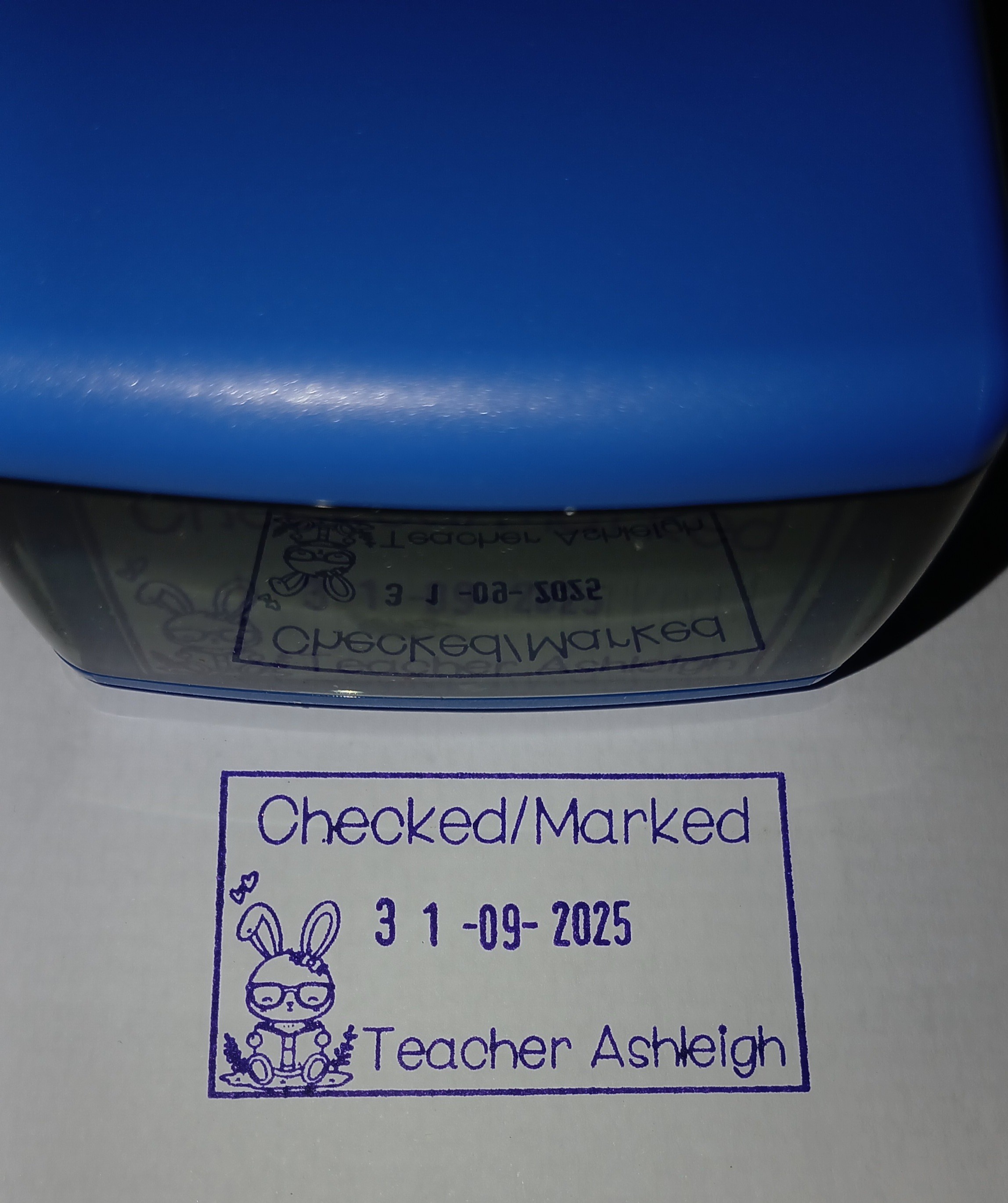 A cute bunny to brighten up the marking of your workbooks.🍏The size of the stamp is 24mmx41mm.🍏It is self-inking.🍏 The adjustable date can adjust to 2036.